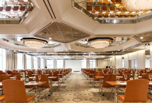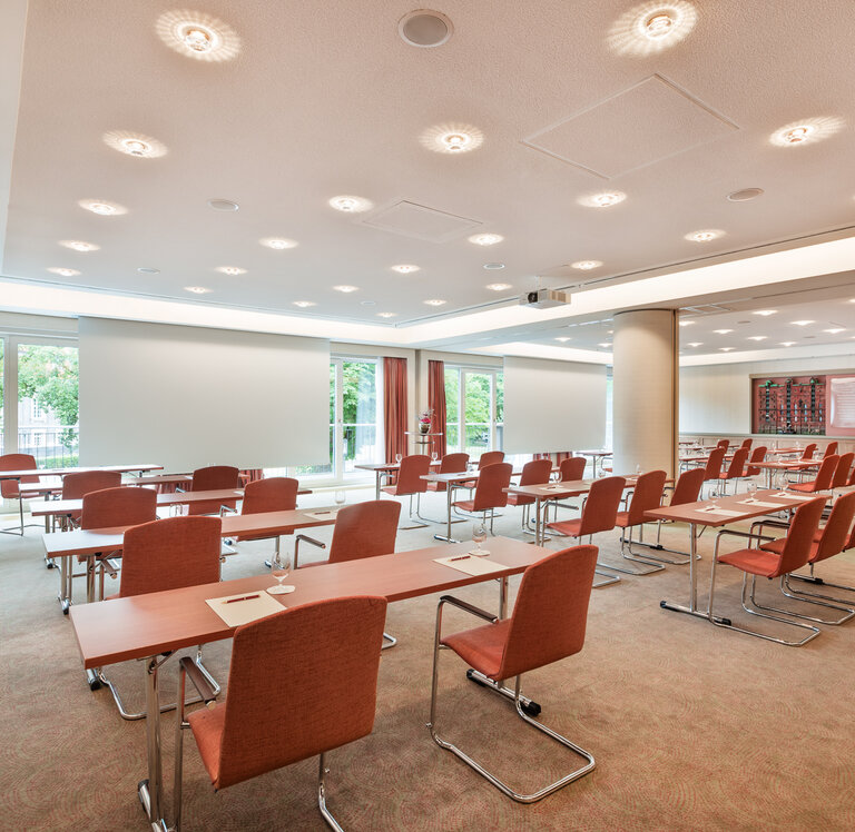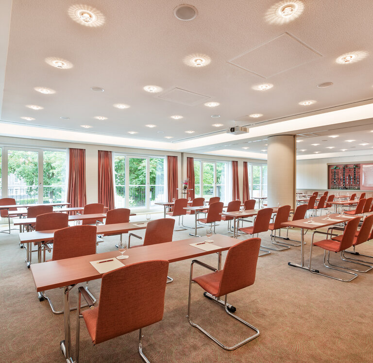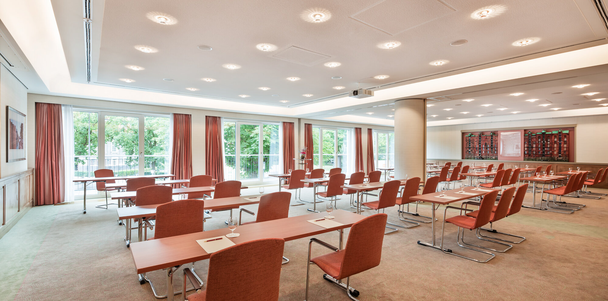 Der Veranstaltungsraum Speicherstadt liegt in der ersten Etage des Grand Elysée Hamburg und bietet 170 m² für Workshops, Empfänge oder Tagungen. Bodentiefe Fenster öffnen den Blick auf die Rothenbaumchaussee und führen auf einen kleinen Balkon. Zwei Raumsektionen ermöglichen eine flexible Gestaltung für Gruppen bis 140 Personen.