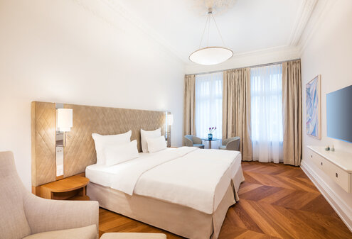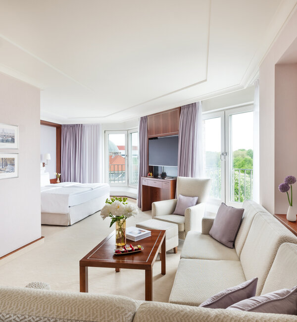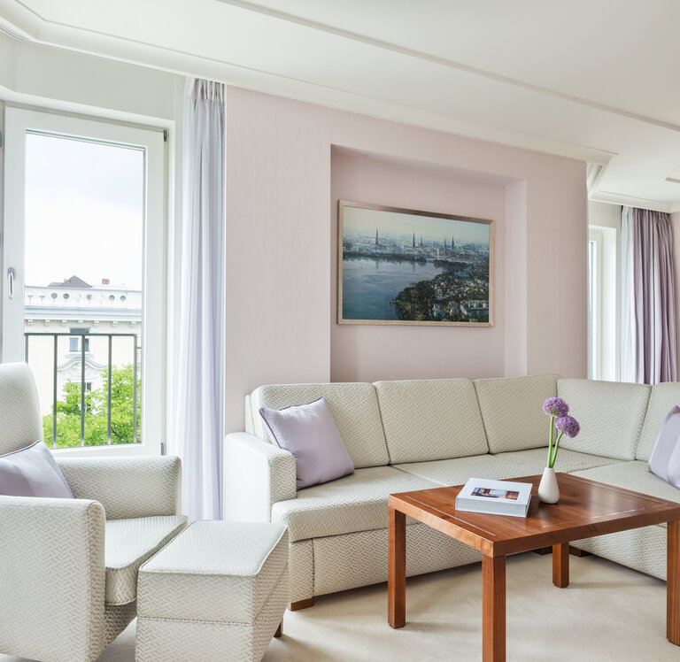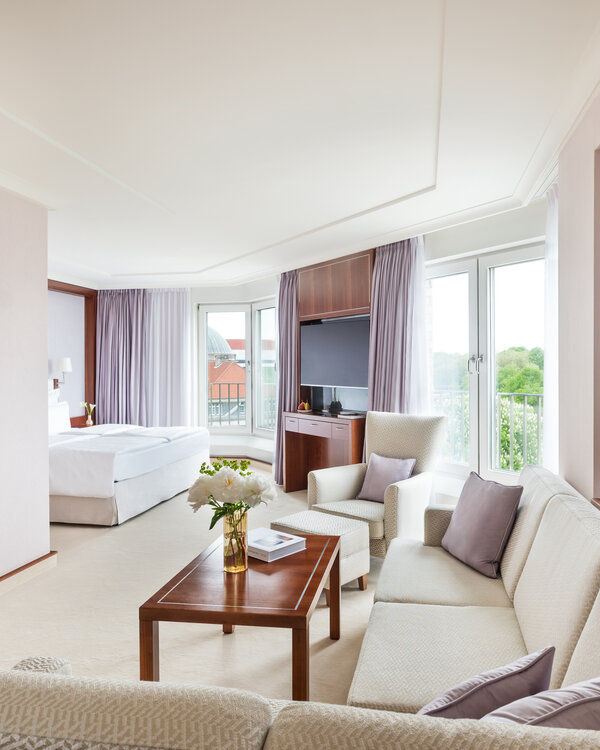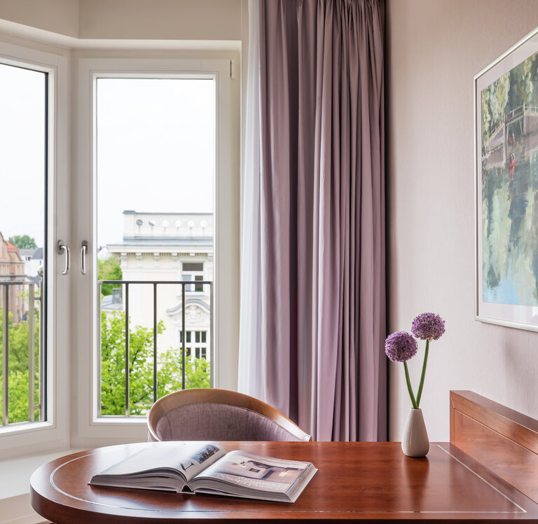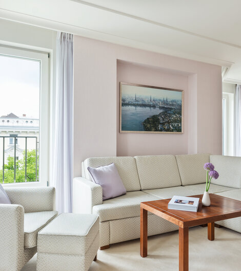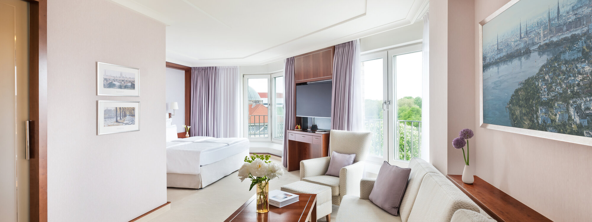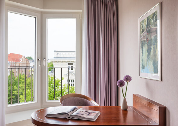 Die tiefen Fenster laden das Licht ein – in unser großes Eckzimmer. Auf 51 hellen Quadratmetern erwarten Sie ein großzügiges Doppelbett, eine bequeme Sitzecke und ein Schreibtisch, an dem Sie ein Kaffee weckt. Der Balkon ist immer offen für eine Brise Hamburg.