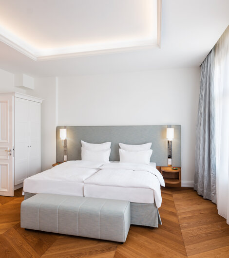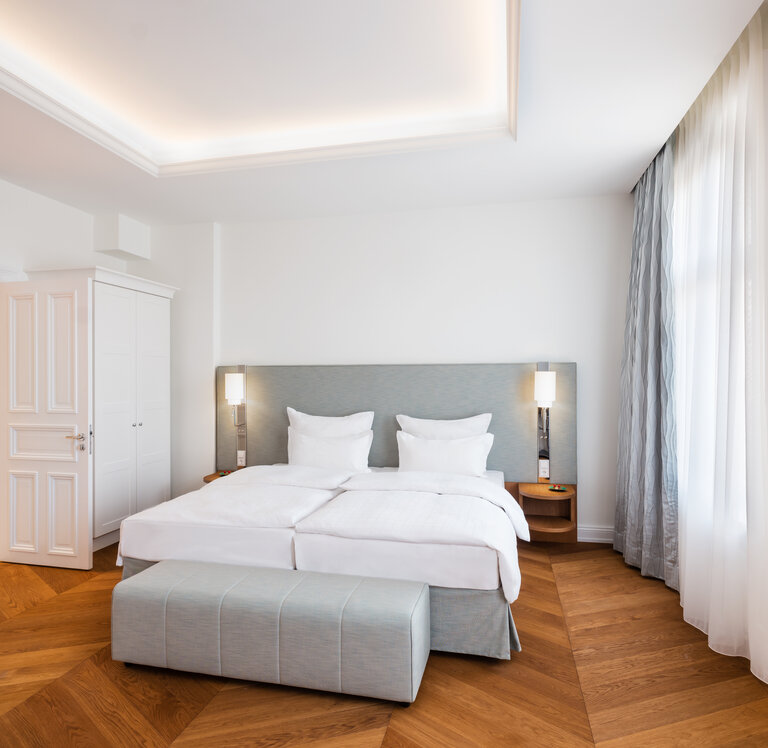 Erwachen in extragroßen Betten und den ersten Espresso mit Blick auf Originalkunstwerke genießen? Das Gefühl von zuhause mit Hotelkomfort kombinieren? Diese Wünsche erfüllt die Villa Deluxe. Hohe Stuckdecken, moderne Kunst an hellen Wänden, warme Töne, leichte Stoffe – es erwarten Sie 48 m2 atmosphärische Wohnlichkeit.